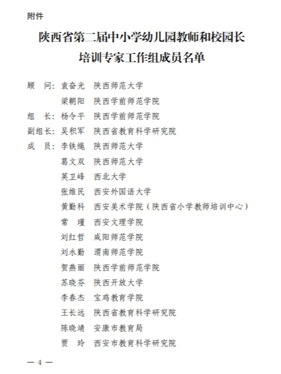 近日,省教育厅下发了《陕西省教育厅办公室关于陕西省中小学幼儿园教师校园长培训专家工作组换届的通知》(陕教师办〔2024〕4 号),成立陕西省第二届中小学幼儿园教师校园长培训专家工作组,Beat365四人成功入选。其中梁朝阳入选工作组顾问,杨令平入选专家工作组组长,贺燕丽、李媛入选专家工作组成员。