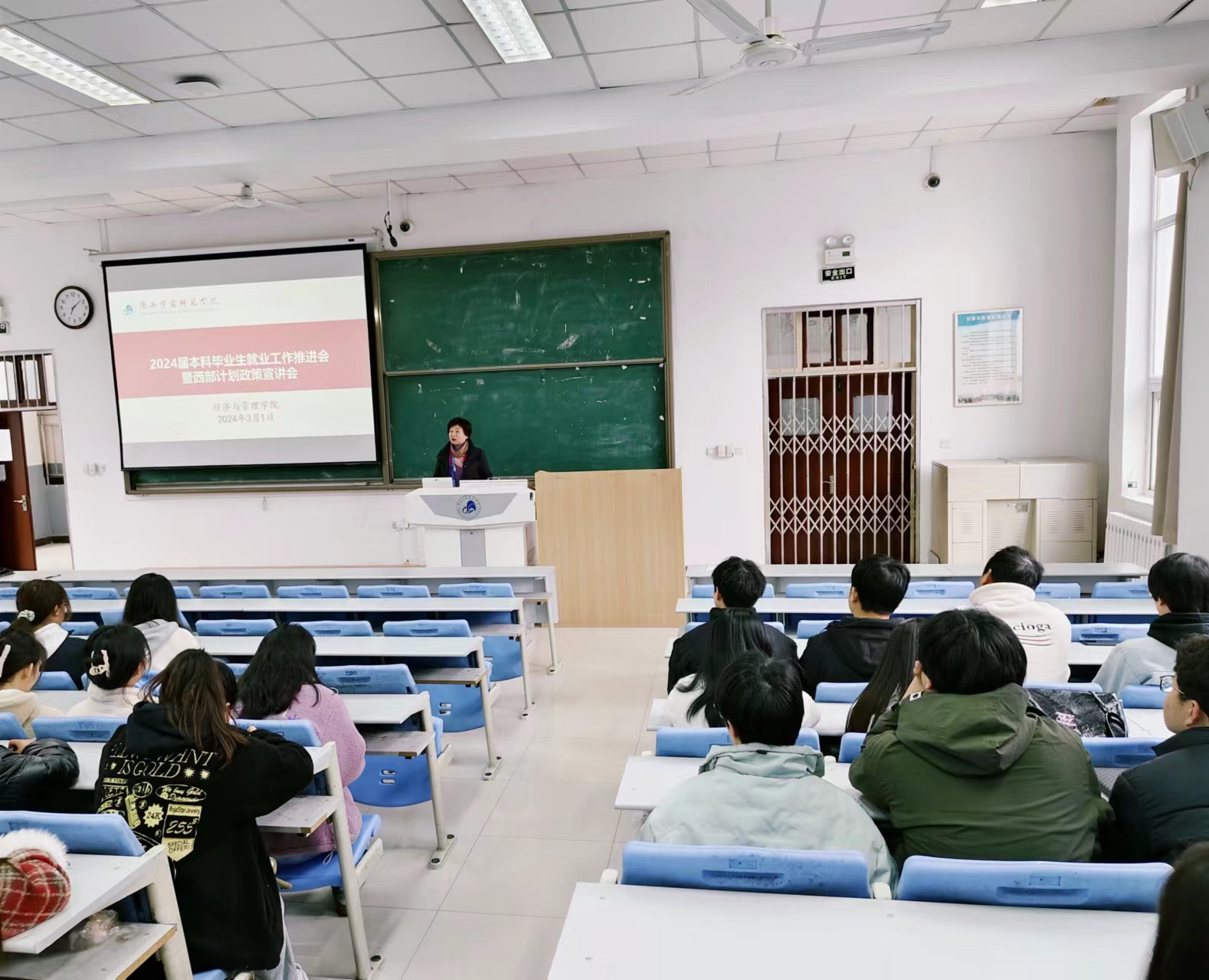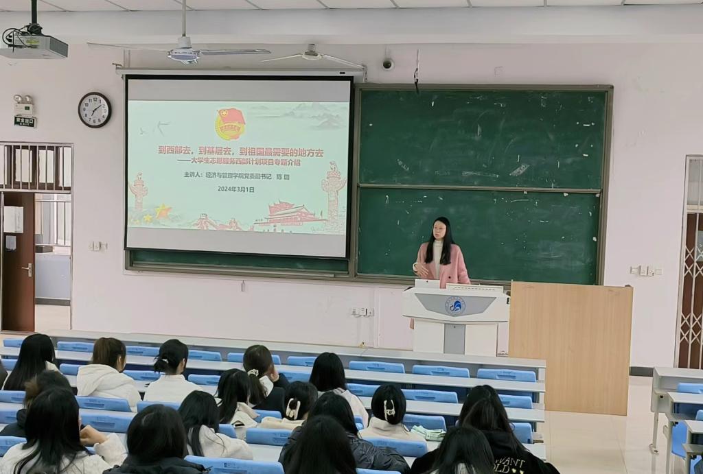 为进一步做好2024届本科毕业生就业工作,帮助毕业生树立正确的择业就业观念,2024年3月1日上午,经济与管理学院在博文楼B2阶梯教室召开2024届本科毕业生就业工作推进会暨西部计划政策宣讲会。学院院长崔洁、学院党委副书记陈璐、毕业班辅导员艾菁、2024届财务管理专业全体学生参加了此次会议。会议由学院党委副书记陈璐主持。