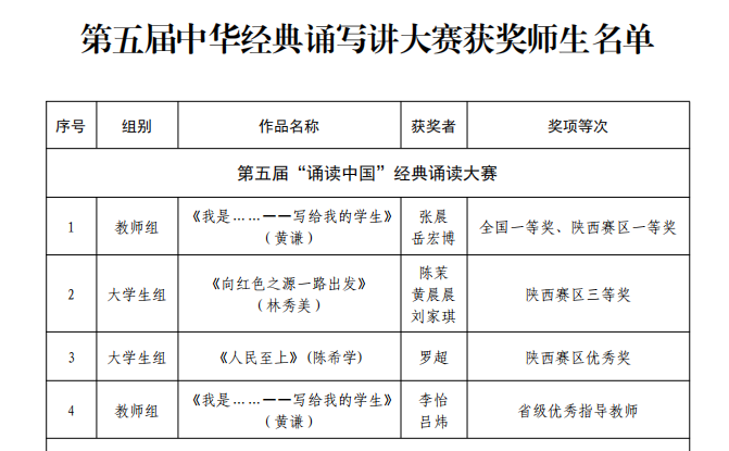 日前,第五届中华经典诵写讲大赛全国总决赛评选结果公布。文学院张晨老师荣获教师组全国一等奖,文学院李怡、吕炜老师荣获省级优秀指导教师。2020级汉语言文学2班陈茉、2022级汉语言文学4班黄晨晨荣获陕西赛区大学生组三等奖,2020级汉语言文学3班罗超荣获陕西赛区大学生组优秀奖。