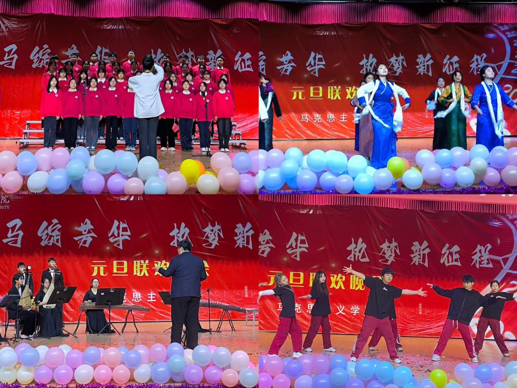 为营造全体师生欢乐愉悦的学习生活氛围,展示学子们积极向上精神面貌,12月29日晚,学院在大学生活动中心举办2024年元旦联欢晚会。本次晚会的节目形式涵盖了舞蹈、歌曲、乐器演奏等多个形式,并打破台上台下的界限,设置了精彩纷呈的互动游戏和抽奖环节。晚会生动展现了马院学子奋进有为、昂扬向上的精神风貌,表达了马院学子人对新年的祝愿、对师院的热爱和对祖国的美好祝福,激励马院学子在新的一年里砥砺奋进,筑梦前行。