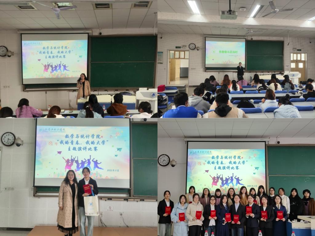 为促进学生讲好普通话,提升语言表达能力,增强自信心,11月21日数学与统计学院在2教楼A3阶梯教室举办了以“我的青春,我的大学”为主题的首届演讲比赛决赛,各年级学生代表近200人到场观看比赛。