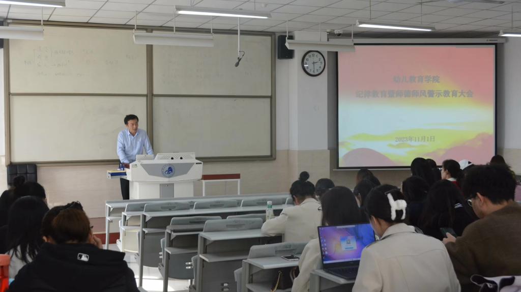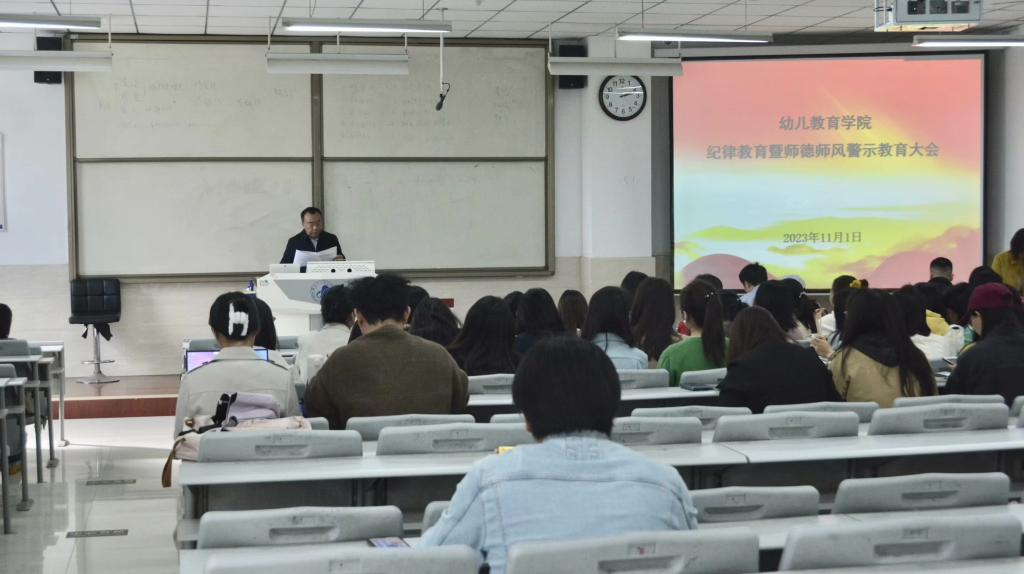 师德师风,为师之本。为牢固树立教师底线意识,切实抓好教师思想政治和师德师风建设工作,规范从教行为,充分发挥典型案例在师德师风建设中的警示作用。幼儿教育学院于2023年11月1日14:30在智慧楼阶梯3教室召开纪律教育暨师德师风警示教育大会。本次大会由幼儿教育学院院长兼党委副书记何善平主持,幼儿教育学院全体教职工参加了本次大会。
