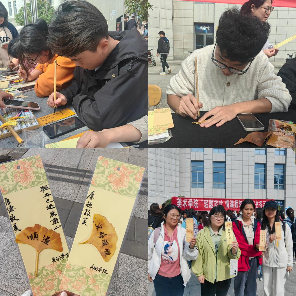 金秋十月,落叶缤纷。图书馆门前,美术学院学生们支好桌椅,备好笔墨、书签和银杏叶,他们发挥专业特长,给一片片银杏叶注入书香,提笔挥毫间,“厚德博学”“未来可期”“平安喜乐”“万事胜意”等美好的祝福和寄语,经墨香晕染,被题写于片片黄叶上,题好的银杏叶被置于带有“美术学院”题字的的书签上,经过塑封,一份份精美、雅致的书签便制作形成,同学们都十分欣喜地获取属于自己的专属书签。美术学院领导和老师们也莅临现场,指导学生们书写书签,并为现场的同学亲手题写书签,吸引了许多同学前来求得自己的心愿书签。这些书签各具特色,饱含真挚的祝福,得到了同学们的一致好评。