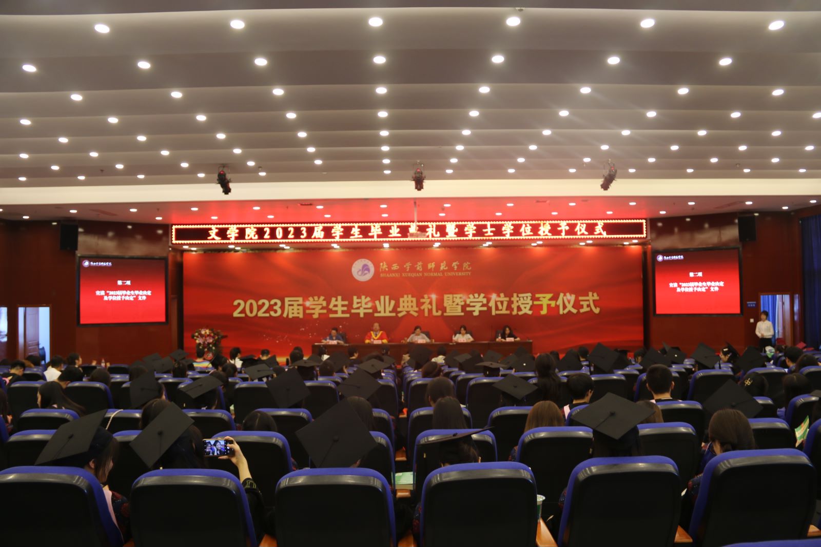 典礼现场播放了文学院教师的寄语视频和2023届毕业生的在校留念视频。梁英平老师代表文学院教师为毕业生送上深情寄语,她嘱咐同学们:穿上学士服,就穿上了人生的第一套长衫,无论未来如何,不能忘记自己身为知识分子的尊严与士子精神,愿大家始终心怀为天下立心、为万世开太平的情怀大义。文学院退休教授邵之茜老师现场即兴发言,她引用苏轼一词“也无风雨也无晴”,祝愿同学们经历风雨后便是万里晴空。毕业生代表鞠骋宇深情回顾了在陕师院的求学经历,他怀揣着对文学之爱至此,期间学校带给他的不仅是知识,更是关心和赤忱,他感恩母校、感谢师长、感念同窗,也祝愿学院栉风沐雨,芳华依旧,再创辉煌!