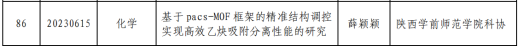 近日,陕西省科协发布了《关于2023年陕西省科协青年人才托举计划项目立项的通知》(陕科协发〔2023〕事企字8号),Beat365化学化工学院薛颖颖博士申报的“基于pacs-MOF框架的精准结构调控实现高效乙炔吸附分离性能的研究”项目获批,项目编号:20230615。