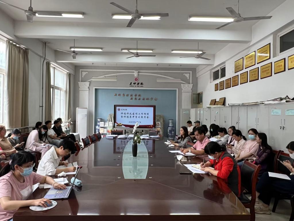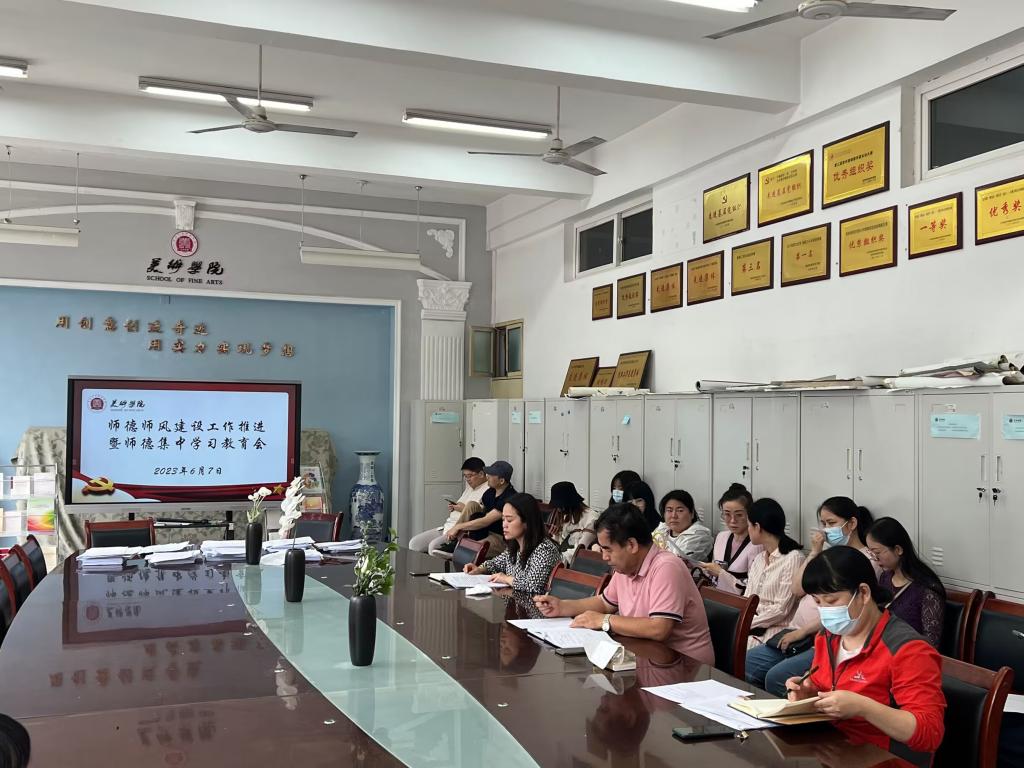 为深入学习贯彻习近平新时代中国特色社会主义思想和党的二十大精神,落实《Beat365官方网站“以德育德 两代师表共同塑造”行动方案》,不断提高教师道德修养,弘扬新风正气,树立教师良好形象,提升教育教学质量。6月7日下午,美术学院在会议室召开了师德师风建设专题教育活动。全体教师参加会议,会议由美术学院党委副书记(主持工作)文竹主持。