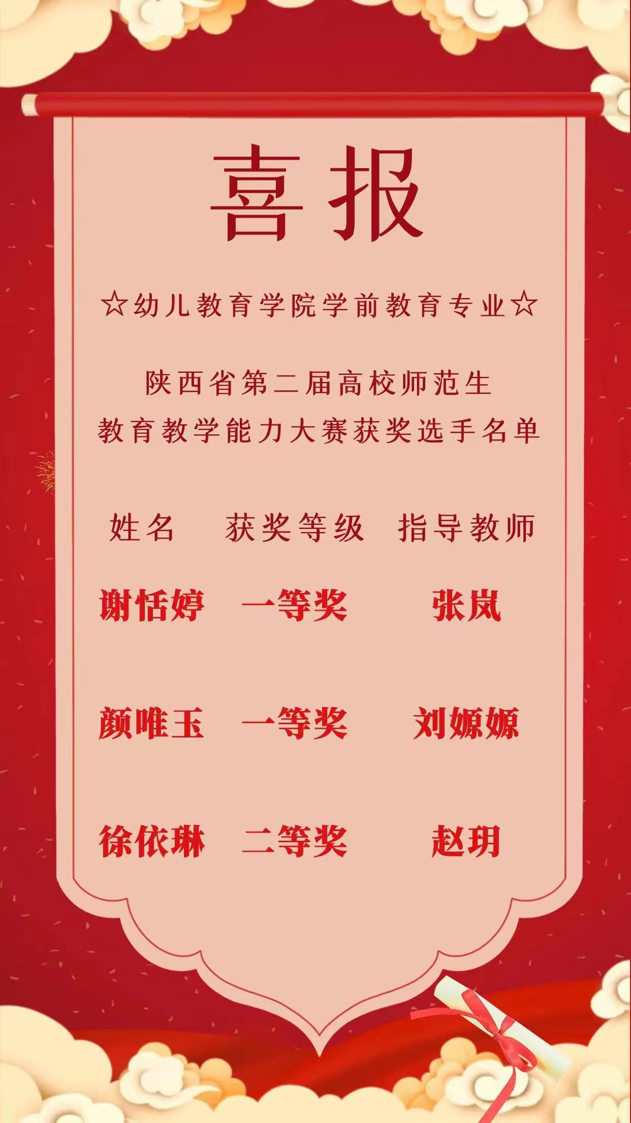 6月2日,陕西省第二届高校师范生教育教学能力大赛决赛结果公布,我院学生在本届大赛中表现突出,取得优异成绩。我院三名同学获奖,谢恬婷同学、颜唯玉同学获一等奖,徐依琳获同学获二等奖。