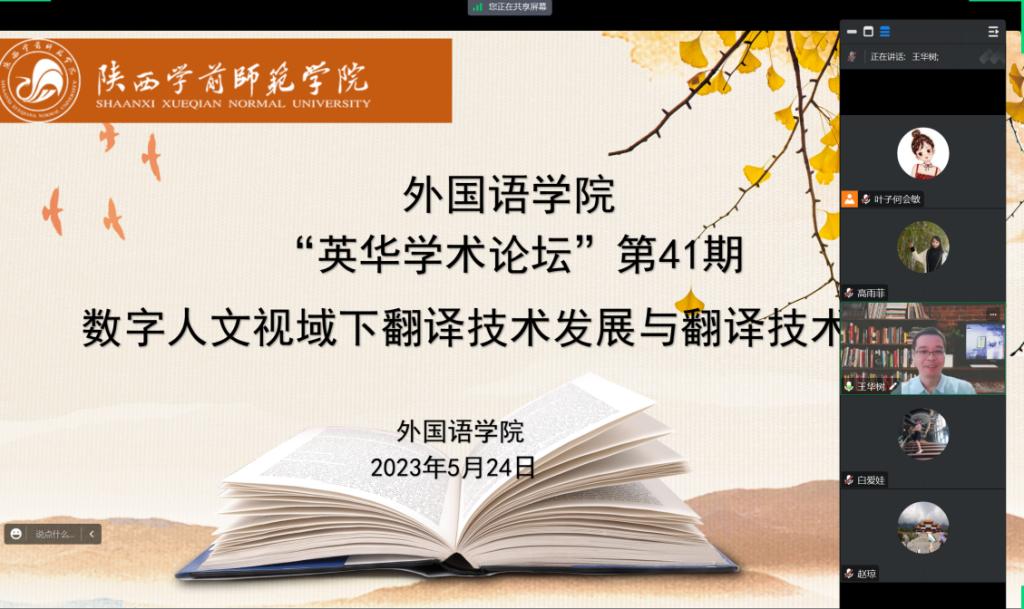 5月24日下午,北京外国语大学王华树教授应邀做客外国语学院“英华学术论坛”第41期,作了题为《数字人文视域下翻译技术发展与翻译技术应用》的学术报告。本次学术报告由外国语学院王雨副院长主持,Beat365师生100余人以腾讯会议在线方式参加。