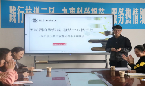 为深入学习贯彻党的二十大精神,进一步传承、弘扬民族文化,加强与少数民族学生和外省学生的沟通和交流,促进民族团结进步,有形有感有效铸牢中华民族共同体意识,做好少数民族和外省学生的教育管理服务工作。3月31日下午,信息工程学院在积学楼A204会议室召开少数民族暨外省学生座谈会。信息工程学院党委副书记,辅导员以及少数民族和外省学生代表参加了座谈会。座谈会由李沛钰主持。