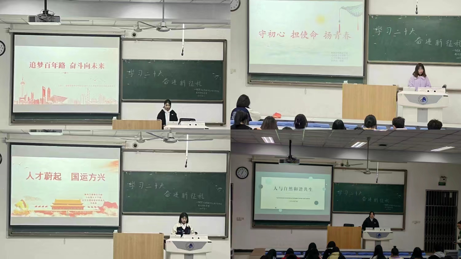 在此次主题宣讲活动中,赵一馨同学以《在新征程中谱写文化新篇章》为题,号召同学们发扬当代青年昂扬向上的时代精神,努力肩负起继承华夏文明的历史责任;赵雪丽同学以《人与自然和谐共生》为题,引导大家尊重自然、保护自然,树立绿色发展的理念;王聪儿同学以《以创新之手 摘科技果实》为题,希望同学们能够学好专业知识,勇于创新,敢于创新,做国家未来的建设者;冯奕晶同学以《人才强国战略》为题,讲述了各行各业先进工作者的优秀事迹,号召广大同学积极向上,接续奋斗,为祖国的繁荣富强贡献青年人的力量;张妍同学以《守初心 担使命 扬青春》为题,号召大家紧跟党走,以优秀共产党员为榜样,勇担时代使命;张童彤同学以《追梦百年路 奋斗向未来》为主题,回顾了中国共产党的百年奋斗之路,号召同学们在新的时代砥砺前行,在奋斗中成长成才。
