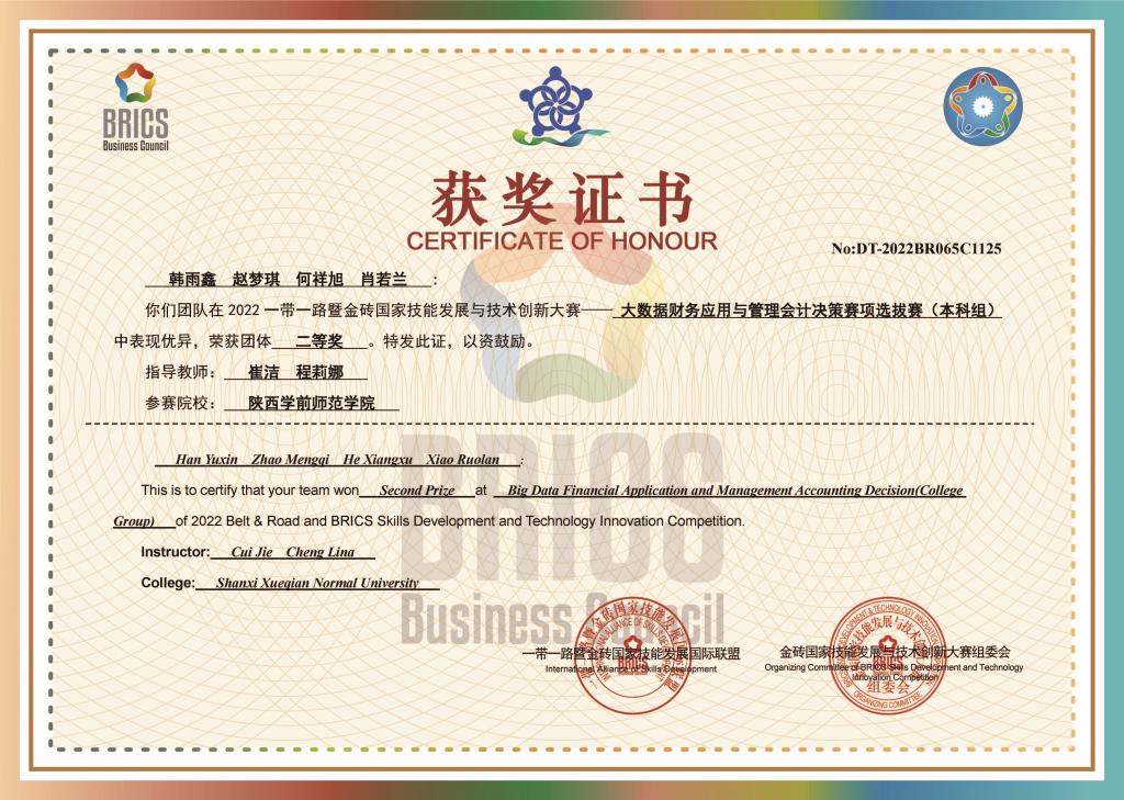 为进一步落实金砖国家关于技能发展工作的相关精神及贯彻落实习近平总书记关于技能人才工作的重要指示精神,共同推进金砖及一带一路国家技能发展与技术创新合作取得更大发展,决定于2022年12月开展第六届一带一路暨金砖国家技能发展与技术创新大赛。大赛由金砖国家工商理事会、一带一路暨金砖国家技能发展国际联盟、中国科协一带一路暨金砖国家技能发展与技术创新培训中心主办,金砖国家工商理事会技能发展工作组承办。本次比赛分本科组和高职组,全国200多所高校参加了本科组比赛。Beat365经济与管理学院财务管理专业的韩雨鑫、赵梦琪、何祥旭和肖若兰经过层层选拔,脱颖而出,代表Beat365参加比赛并取得了二等奖的好成绩。