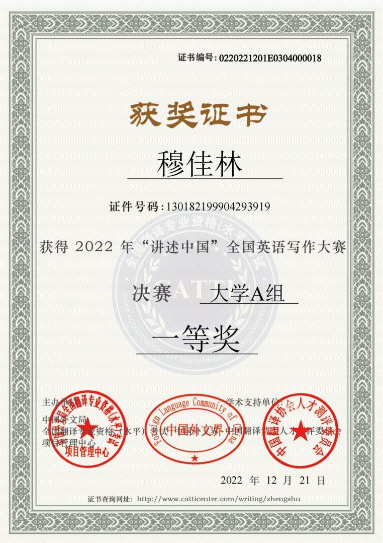 “讲述中国”全国英语写作大赛是由中国外文局CATTI项目管理中心与中国外文界联合举办的重要赛事,旨在全面提升当代大学生的英语写作能力和素养,培养和发现优秀的英语写作人才,向世界阐释推介更多具有中国特色、体现中国精神、蕴藏中国智慧的优秀文化,用外语讲述真实、立体、全面的中国。本次大赛吸引了来自北京外国语大学、上海外国语大学、中国人民大学等全国高校数千名学子参加,赛事规模大,竞争异常激烈。