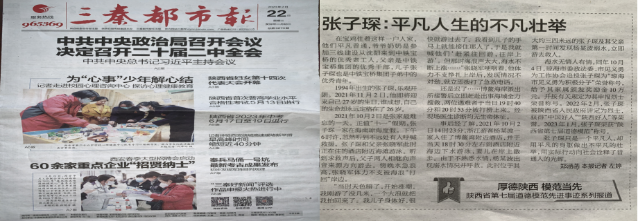 2023年2月22日三秦都市报在“厚德陕西 模范当先 陕西省第七届道德模范先进事迹系列报道”专栏,报道了我院优秀毕业学生张子琛同学的英雄事迹雄。他是一个平凡的人,却用平凡的身躯做出了不平凡的壮举,用实际行动向社会诠释了普通人的光辉,他就是勇救溺水者的张子琛。
