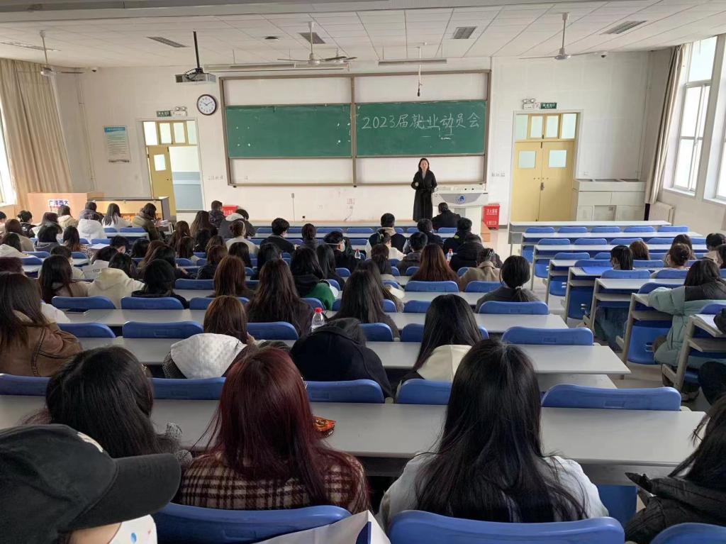 首先,学院党委副书记(主持工作)文竹提出毕业生要提高站位,充分认识当前就业的严峻形势,提升就业意识和紧迫感。并向毕业生解读了就业工作的相关政策和措施,介绍了升学、应征入伍、基层就业、自主创业等就业形式,提出2023届毕业生就业工作总体目标。建议毕业生要发挥自己的专业特长,抓紧机遇,树立正确的就业观念。要准确认识自我,端正就业心态,积极就业,发挥优势,积极参加招聘会投递简历,杜绝“慢就业”、“懒就业”现象。她鼓励更多毕业生积极参军入伍和面向基层就业,寻找就业机会,积累工作经验,为今后职业发展奠定基础。最后,她强调毕业生在求职就业过程中要树立遵纪守法意识,加强就业诚信和安全防范意识,确保就业过程人身财产安全。
