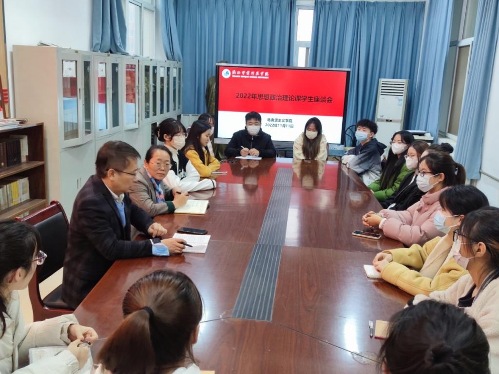 为贯彻落实习近平总书记主持召开的学校思想政治理论课教师座谈会上的重要讲话精神, 进一步了解教师的教学情况和学生的学习情况,改进教学与管理中存在的问题与不足,进一步优化思想政治理论课的教学设计、实施过程,不断提升教学效果,推进思政理论课高质量开展,2022年11月11日,马克思主义学院召开思想政治理论课学生座谈会,听取学生关于思想政治理论课教育教学的意见和建议。