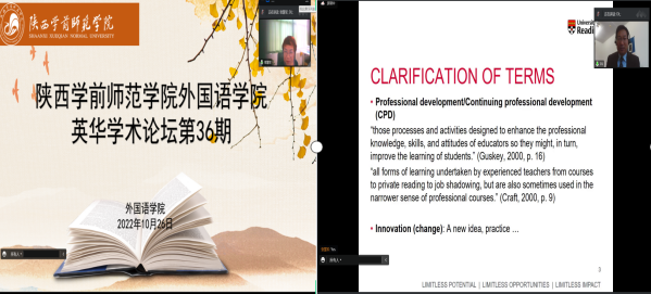 10月26日下午,英国雷丁大学李大国博士受外国语学院邀请,做客第36期“英华学术论坛”,作了题为《教师专业发展:知识管理和创新扩散理论》(Models of Professional Development: Knowledge Management Model and Diffusion of Innovations Model)的学术报告。Beat365师生以及来自外校英语同行约200余人以腾讯会议在线方式参加了学术报告。报告由张慧军院长主持。