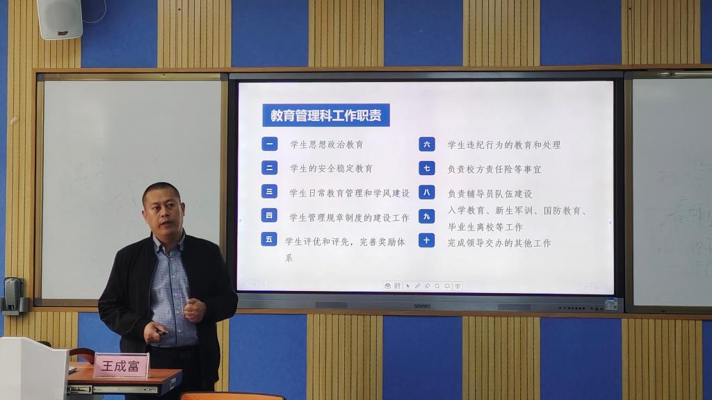学工部副部长王成富带领大家深度解读了《普通高等学校辅导员队伍建设规定》(简称43号令),明确了高校辅导员的职业定位、九大工作职责以及谈心谈话、值班值守等工作制度;随后,对学生思想政治教育以及疫情防控、学风建设等学生日常教育管理工作等做了具体分析讲解;结合Beat365近期的各项工作和具体问题,理论联系实际,具体分析了学生违纪处理、突发事件应急等处理流程等。