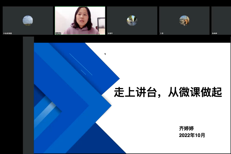齐婷婷老师从文件解读、微课定义、课程设计和案例分析四个方面进行了报告。首先,齐老师从微课评分标准和参赛作品申请表填写两方面入手,重点解读了第四届全国师范生微课大赛的相关文件;其次,齐老师介绍了微课的定义,详细介绍了微课的主题突出、形式多样、内容短小精炼、指向性明确和教学目标清晰等特点,并将其概括为“短、小、精、活”;接着,齐老师重点介绍了微课的设计,她强调微课的设计中,确定主题时要注重简洁和实用性;要做到“随风潜入夜,润物无声处”的真情境、“实现思维与过程的可视化”的真思考和“分层训练,形成学习链”的真学习;整体设计更要注意主线贯穿、环节齐全、关注教态和呈现板书。一节好的微课就是要做到“目中有生脑中有线、讲中有思、心中有情”。最后,齐老师跟大家分享了自己两个微课作品。从优秀的作品展示中,齐老师对微课的设计进行了细致入微的示范和指导。