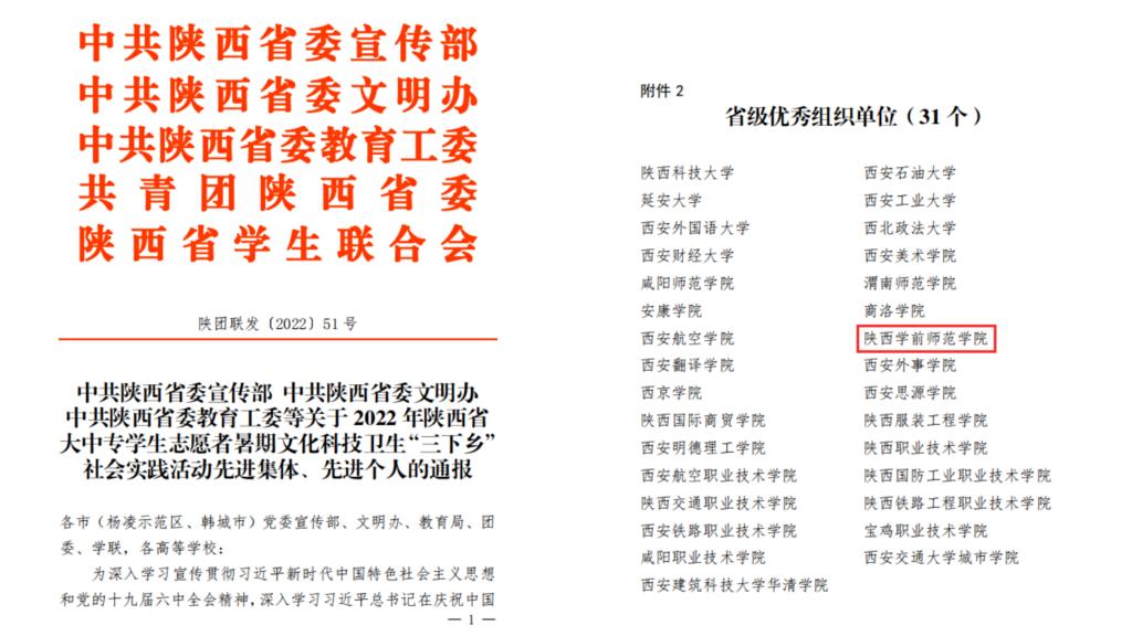 近期,在省委宣传部、省文明办、省委教育工委、团省委、省教育厅、省学联等联合下发的《关于2022年陕西省大中专学生志愿者暑期文化科技卫生“三下乡”社会实践活动先进集体、先进个人的通报》中,由数学与统计学院和体育学院联合组建,张振华、赵耀彤两位老师带队的“砥砺薪传二十大,文化体育两开花”青年扶志实践队荣获“省级优秀团队”称号,数学与统计学院团总支书记赵耀彤荣获“省级先进个人”称号,学校荣获“省级优秀组织单位”称号。