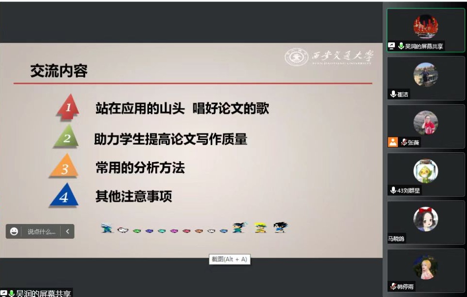 吴润教授结合2022届财务管理专业毕业论文指导工作中总结的经验,从论文选题、开题报告撰写、分析方法使用、排版规范等四个方面对师生进行了细致的指导。吴教授强调,毕业论文是大学学习阶段的最后一个环节,是对所学基础知识和专业知识的一种综合应用,是一种综合的再学习、再提高的过程,这一过程也是对学生学习能力和独立工作能力的培养,希望同学们高度重视,交出满意的答卷。