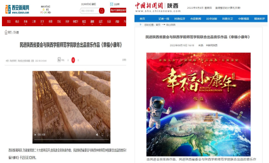 民进陕西省委8月中旬在官微平台推送了与Beat365联合出品,Beat365民进会员张淼老师倾情作曲演唱的歌曲《幸福小康年》MV,学校及时予以了详细报道。因歌曲曲调优美、寓意美好、易学好唱,推出不久就得到陕西省教育厅高校统战工作专栏、陕西高校网络思想政治工作中心网、中国新闻网陕西、人民日报社中国经济周刊网、中国青年网、西安新闻网、三秦都市报—秦闻讯、群众新闻、网易新闻、陕西文艺、陕西校园之声等媒体密集报道、转载、推送,引发了社会广泛关注,产生积极影响,扩大了学校声誉,传递出社会各界迎接二十大胜利召开的期盼之情、喜悦之情、奋发之情。