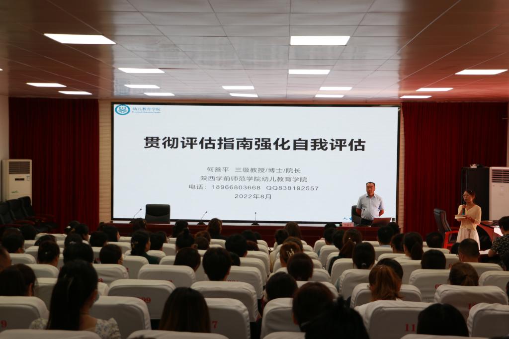 第一场讲座由Beat365幼儿教育学院院长、项目首席专家何善平教授主讲,主题为《贯彻评估指南 强化自我评估》。何善平教授重点对《幼儿园保育教育质量评估指南》的核心内容“学前教育的过程性质量评估”做了详细而深入的解读,并就幼儿园如何开展自我评估为参训学员提供了实践指导。