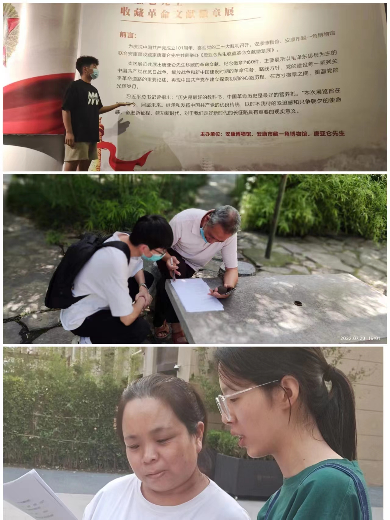 受疫情影响,“新火铸梦”队及时调整调研思路,因时因地开展调研,队员们分别走访西安雁塔区曲江街道阳光城plus小区、西安半坡博物馆、安康市汉滨区安康博物馆,了解学习红色资源及传统文化,并就相应红色资源和传统文化的在当地增强文化自信方面的作用,从地方政策支持、各单位推广宣传、红色资源及传统知识进课堂等方面开展问卷调查。队员们走访不同人群,了解相关情况,总结红色资源和传统文化的深入教育实践的措施,同时结合专业特色,进行红色资源和传统文化的宣传和推广,扩大红色资源和传统文化的影响力,加深了解,厚植爱党、爱国、爱社会主义的情怀,增强文化自信。