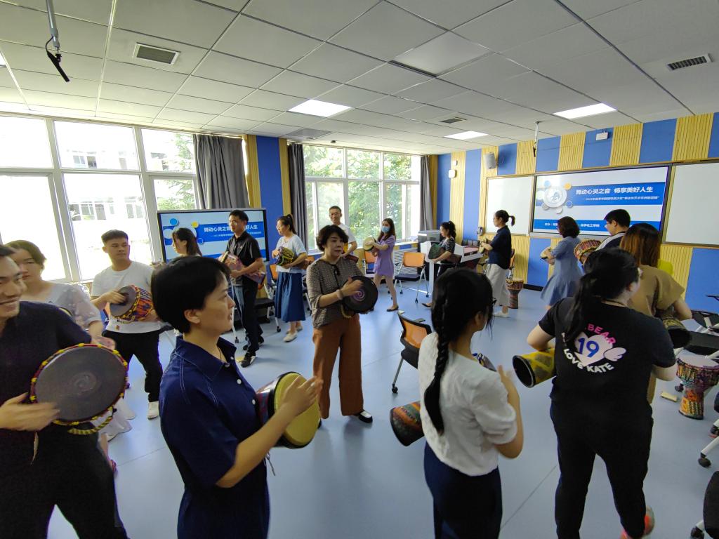 “鼓圈”是团体音乐治疗的一种形式,参与者在鼓圈中缓解压力,提高社会交往和适应能力,确立自我效能感和存在意识,增强团队凝聚力和机体活力。十分适用于以积极心理学为取向的个人成长、团队建设和心理治疗。本次活动中,金焰老师带领大家放松心情,愉快地走进“鼓圈”世界。金老师首先介绍了“鼓圈”的打击乐器和非洲鼓的基本演奏方法,用清脆的声音引领大家拍打节奏、变换节奏。在金老师的指挥下,场地里所有的非洲鼓同时开始演奏,时而击打,时而停止,大家渐渐地把鼓声和节拍融合在一起,也渐渐地舒缓情绪、放松身心。参与团辅的辅导员老师们仔细地看,安静地听,认真地学,努力地模仿,大家跟随着节奏、鼓点律动起来,在富有节奏的鼓声中,相互磨合,达成默契,渐渐兴致高涨,释放自我,超越自我,融入集体。在老师的引导下,大家开始用创造性的方式来展示自己。金老师还将辅导员工作中的学生工作案例,巧妙融进非洲鼓团辅活动,让大家找寻解决问题的方法。