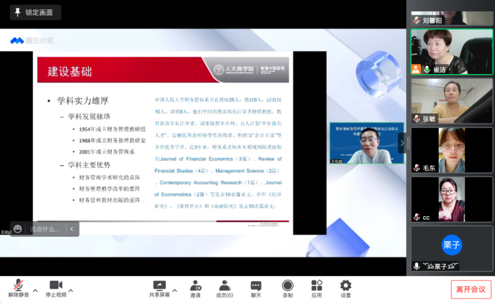 经济与管理学院财务与会计系全体教师于7月11日上午8:30,通过线上形式参加教育部财务管理课程虚拟教研室启动仪式暨教学改革研讨会,会议由教育部财务管理课程虚拟教研室主办,中国人民大学商学院、中国人民大学出版社和中国人民大学财务会计研究所承办。会议邀请中国人民大学商学院院长叶康涛教授;上海财经大学副校长、教育部本科会计教学指导分委员会主任、教育部会计学专业虚拟教研室负责人陈信元教授作重要发言,中国人民大学商学院的王化成教授、北京大学光华管理学院的陆正飞教授作主题报告。