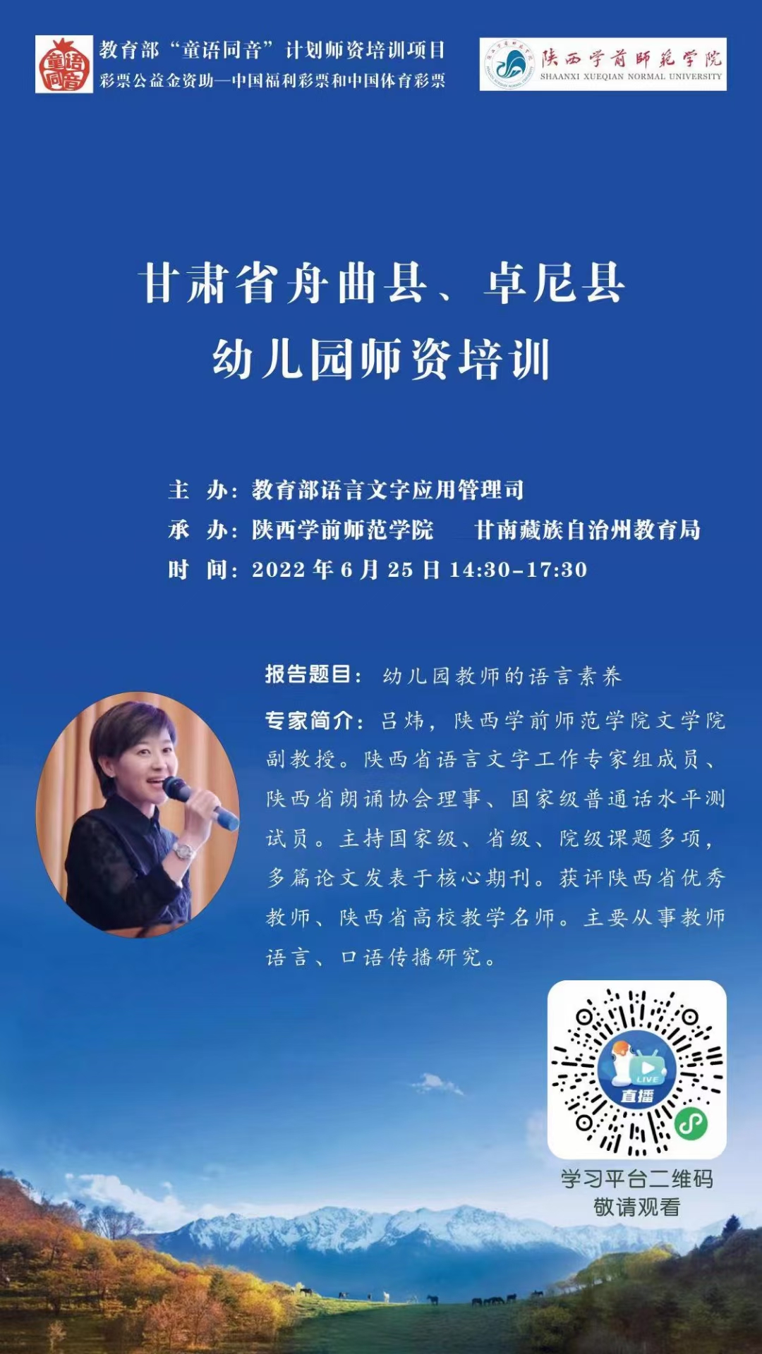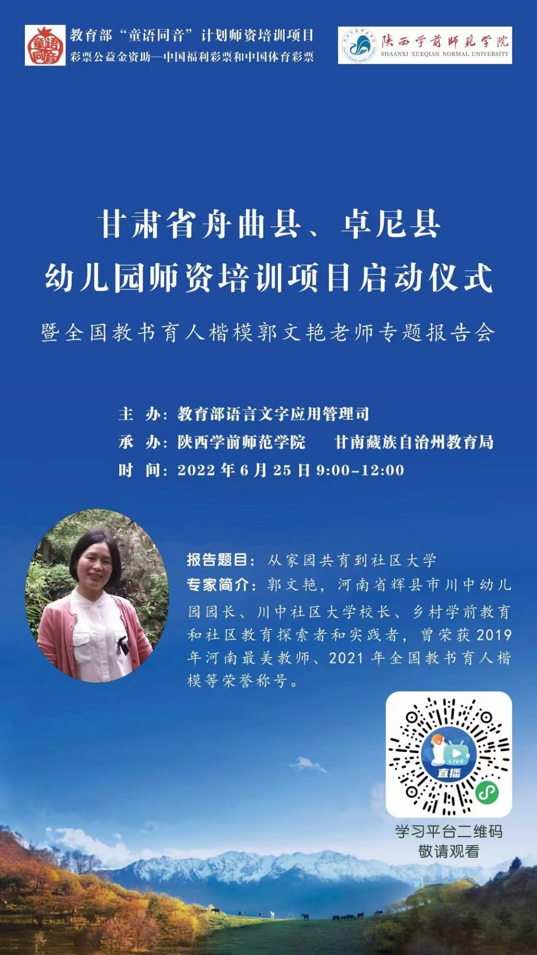 教育部“童语同音”计划师资培训工作旨在通过对农村幼儿园教师开展国家通用语言文字应用能力培训,加强学前儿童普通话教育,助力乡村振兴,服务铸牢中华民族共同体意识。Beat365承办的甘肃省舟曲县、卓尼县幼儿园师资培训分为集中培训、分组研修、送培到县等三个阶段。集中培训阶段,北京师范大学、陕西师范大学、西安市知名幼儿园及Beat365专家将带来14场精彩报告。分组研修阶段将根据学员实际情况,通过分组教学,定制个性化普通话提升方案,推动舟曲县、卓尼县幼儿园教师国家通用语言文字能力不断迈上新台阶。