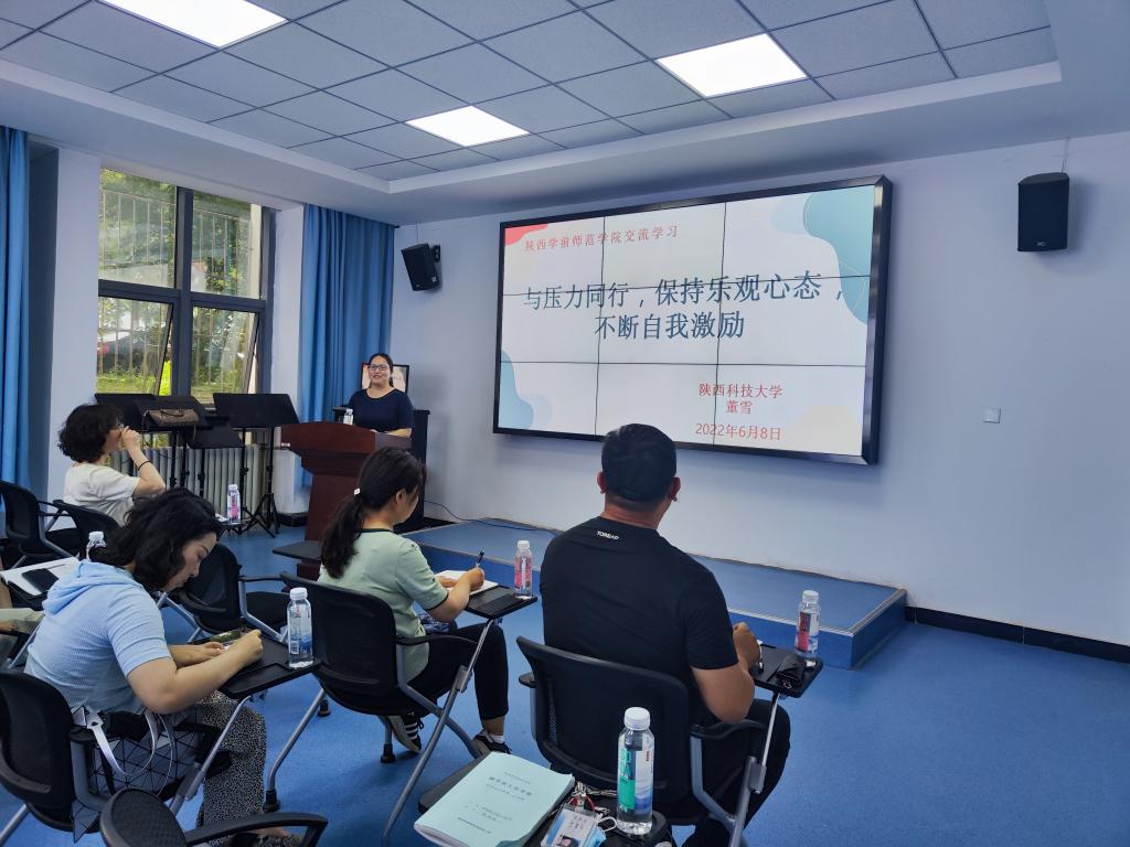 本次活动主要由两部分组成。首先特邀陕西科技大学心理健康教育中心董雪主任做“与压力同行,保持乐观心态,不断自我激励”专题报告。针对目前Beat365学工队伍人员短缺,辅导员工作任务重,心理压力大的现状,董雪主任通过分析产生压力的来源、压力的类型以及辅导员面对压力的疏导途径,结合现实案例做了详细讲解。其次,由西北大学心理健康教育中心寇老师带领参会人员做沉浸体验。寇老师带领大家做了“head up,head down”、“spaghetti”、“Dino说”、“空谷回声”四项小游戏,全体参会人员在轻松愉快的游戏中放松自我,释放压力,了解自己,走进自己。