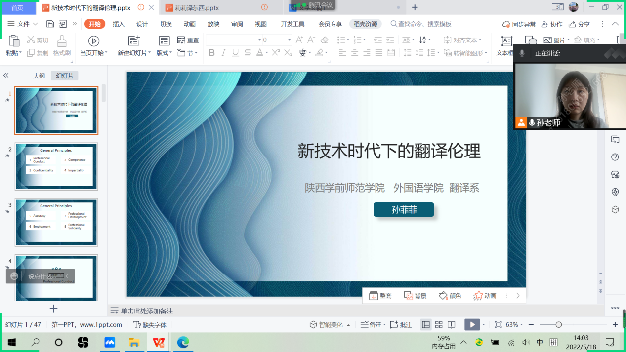 2022年5月18日下午,外国语学院翻译系副教授孙菲菲老师做了题为“新技术时代下的翻译伦理”的线上学术讲座,来自2020、2021级翻译专业本科生和2019级英语专业本科生近百名学生参加了此次云端讲座。
