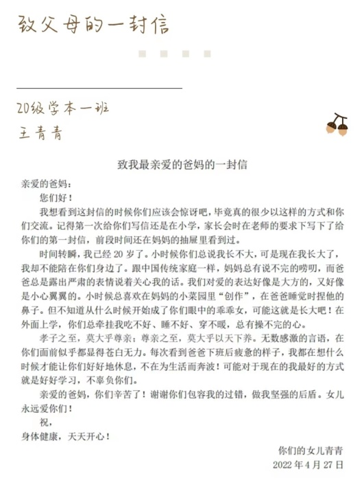 本次活动同学们积极性强,参与度高,用激情的语言抒发了对祖国、父母、老师以及医护人员的感激之情,颂扬了身边的动人事迹。学院充分利用新媒体的宣传引导功能,及时宣传报道和展示活动开展情况。其中,2020级学前教育(科学)一班的王青青同学以“致我最亲爱的爸妈的一封信”讲述了父亲母亲对自己无私绵长的爱,令人感动;2021级数据科学与大数据技术二班孟钰涵同学的“致学校医护人员们的一封信”以饱满的热情和真挚的话语表达了对医护人员诚挚的感激,引起了大家强烈的共鸣。其他同学也用最朴实的话语,最纯真的感情向身边的家人、朋友等表达出自己的感恩之心。