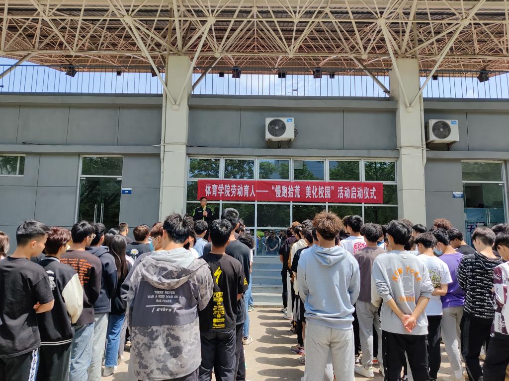 2022年4月28日中午,体育学院在田径场举行劳动育人——“慢跑拾荒 美化校园”活动启动仪式。体育学院副院长卫荣辉、党委副书记李强、辅导员张振华参加了启动仪式。
