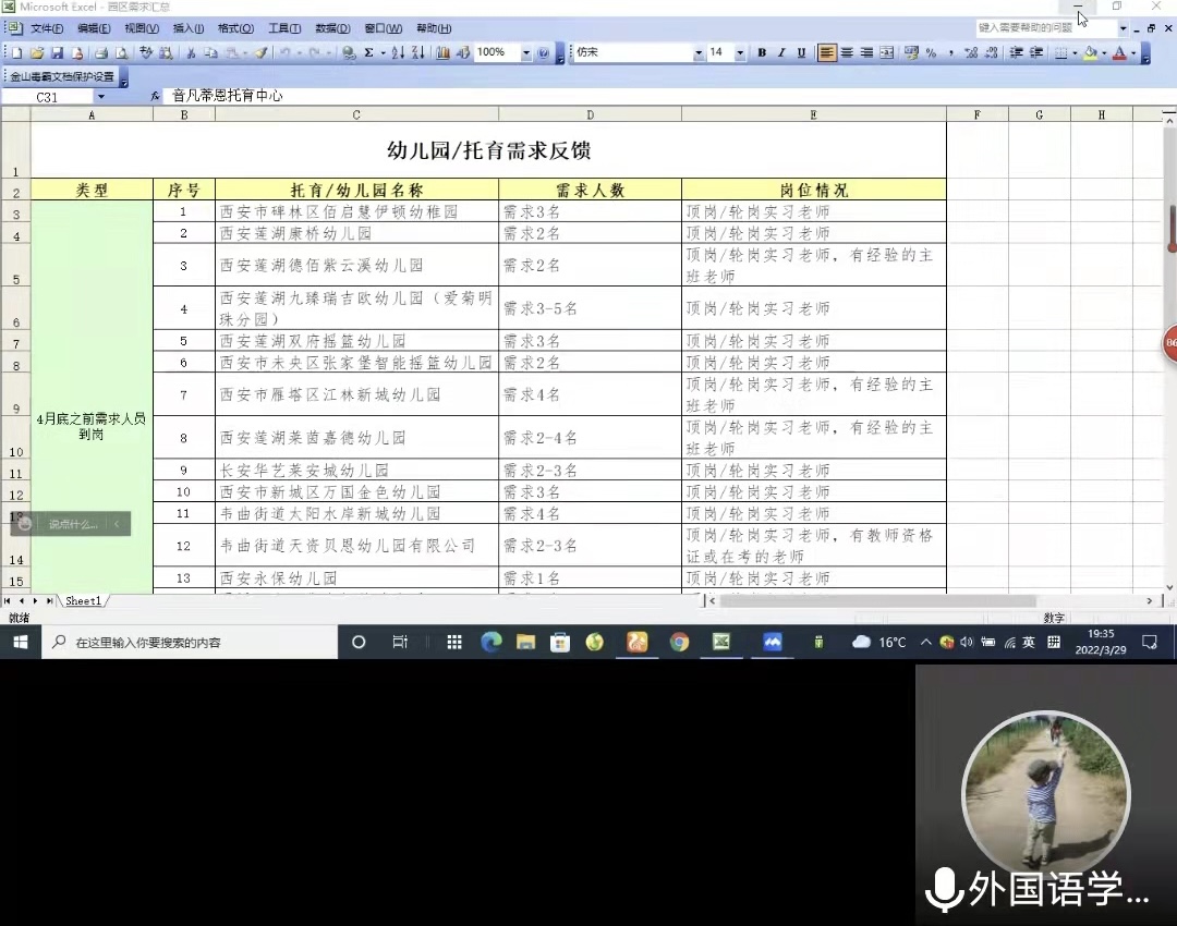 为了进一步推进疫情常态化下2022届毕业生的就业指导与服务,外国语学院与陕文投集团文投教育搭建就业合作平台,于2022年3月29日晚7:30召开2022届毕业生“文投幼狮蒲公英计划”线上招聘会。学院副书记(主持工作)高海燕、副书记侯文彬、毕业班辅导员、文投教育田老师、100余名毕业生参加了招聘会。