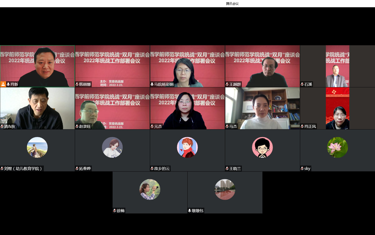 会上,肖新副部长首先组织学习了2022年“两会”精神,重点领学了习近平总书记在“两会”期间提出的“5个必由之路”“5个战略性的有利条件”两个重要论断,指出这两个重要论断,准确把握形势,凝聚前行信心,共同传递出党团结带领人民在新起点上沿着正确道路继续奋进的决心、定力与信心,闪耀着习近平新时代中国特色社会主义思想的光辉。同时,会上传达了全省统战部长会议精神及《教育工委关于做好2022年度教育系统统战工作的通知》相关精神,统一了思想,凝聚了共识,明确了工作重点。