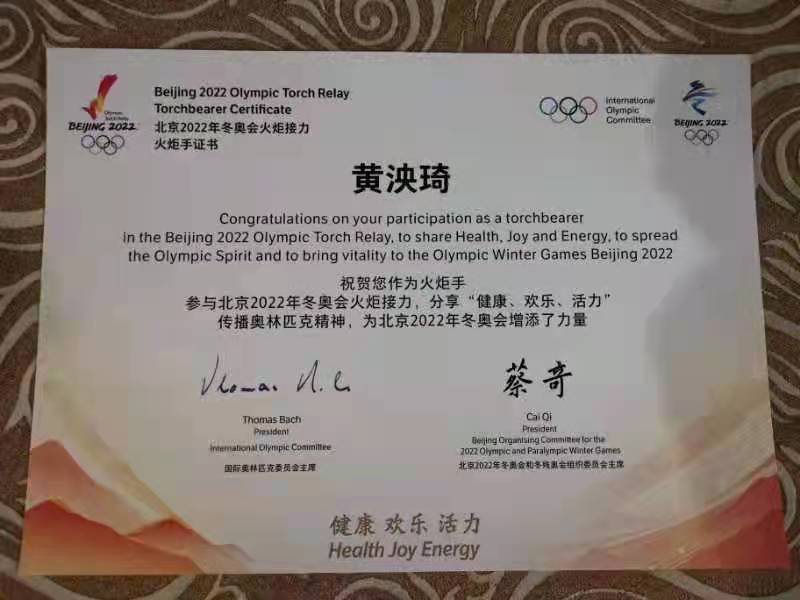 Beat365官方网站幼儿教育学院学前教育专业2016届本科毕业生、全国“五一劳动奖章”获得者黄泱琦参加了2月2日在北京奥林匹克森林公园的火炬接力活动,她是火炬传递的第101棒,充分展示蓬勃向上的精神风貌,积极传播分享“健康、欢乐、活力”传播奥林匹克精神,为北京2022年冬奥会增添力量。