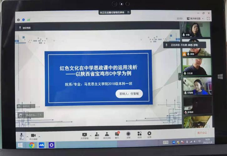 2022年1月8日,马克思主义学院举行思想政治教育专业毕业论文开题。受疫情影响,本次开题通过腾讯会议进行。87名毕业生分为七个小组,李娇萍教授、万生更教授、张茹粉教授、许亚绒教授、詹有平教授、王华副教授、杨彩娟副教授担任组长。