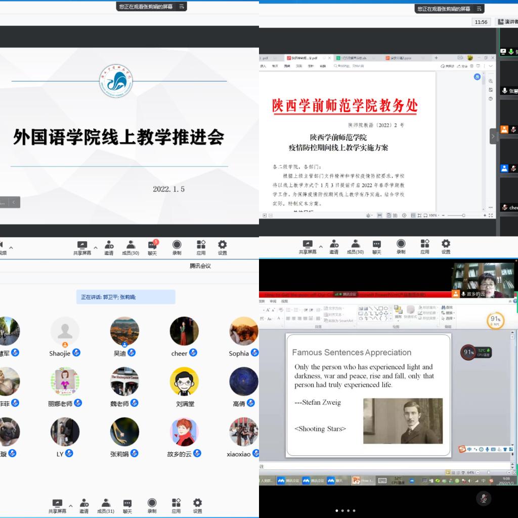 2022年1月5日下午,外国语学院召开线上教学工作推进会,来自英语系、翻译系31名教师通过腾讯会议相聚云端,就疫情期间2021-2022学年第二学期专业课在线教学情况进行了深入交流与讨论,会议由张莉娟副院长主持,张慧军院长参加了此次会议。