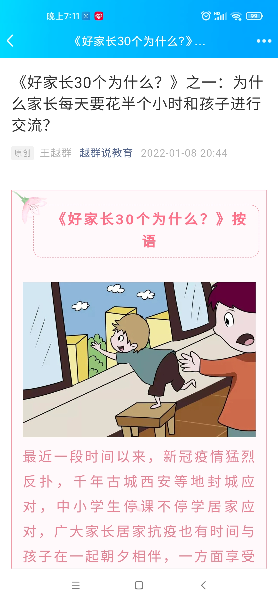 岁末之际,新冠疫情猛烈反扑,古城西安等地封城应对,中小学生停课不停学居家应对,广大家长居家抗疫也有时间与孩子在一起朝夕相伴,一方面享受了更多与孩子相处亲情幸福,另一方也增多了与孩子之间磕磕碰碰的频率,幸福与烦恼同时涌上心头,期盼着针对孩子教育的具体问题能够有良方相解。Beat365民进主委王越群教授牢记参政党职责使命,心系学生成长,计划陆续推出30篇所撰家庭教育系列千字小文《好家长30个为什么?》,希冀对广大中小学生家长和老师及家庭教育爱好者有所裨益,现在已推送第一讲。