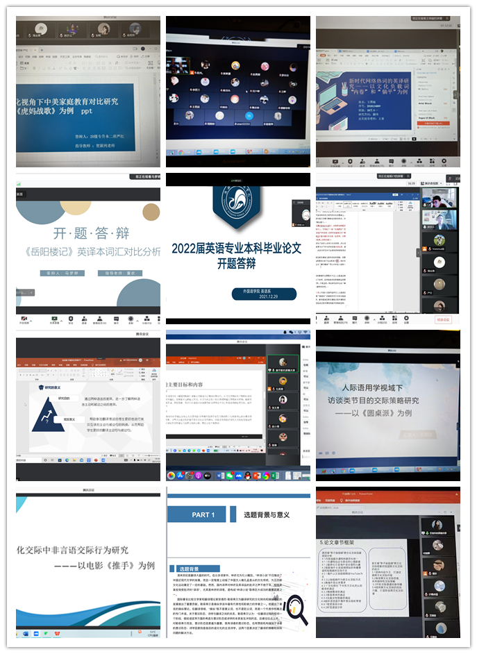 2021年12月29日,外国语院举行2022届英语专业毕业论文线上开题答辩。本次线上开题答辩共139名毕业生参加,答辩共分为十个小组,不同小组分别在腾讯会议不同时段进行,每组三到五名评审教师,每组组长均由教授或副教授担任。