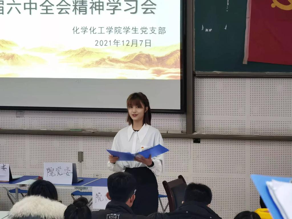 为深入学习贯彻党的十九届六中全会精神,把握精神实质、领会核心要义,化学化工学院于12月7日,在积学楼B3阶梯教室开展了十九届六中全会精神专题宣讲暨入党知识教育培训活动。化学化工学院学生党支部第一书记陈晓璐、全体学生党员、入党积极分子参加了此次活动。