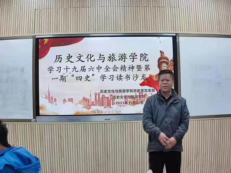 为深入学习十九届六中全会精神,贯彻落实习近平总书记关于学“四史”的重要指示精神,进一步学习领会中国共产党百年奋斗的重大成就和历史经验,教育广大师生做到知史爱党,知史爱国,从而坚定历史自觉,增强使命担当,11月24日下午,历史文化与旅游学院历史系党支部在1B203智慧教室开展了学习十九届六中全会精神暨第一期“四史精神”学习读书沙龙活动。学院党委书记童广运和历史系党支部全体党员老师以及历史学专业部分学生党员、积极分子参加读书分享活动。活动由历史系党支部书记韩小婷主持。
