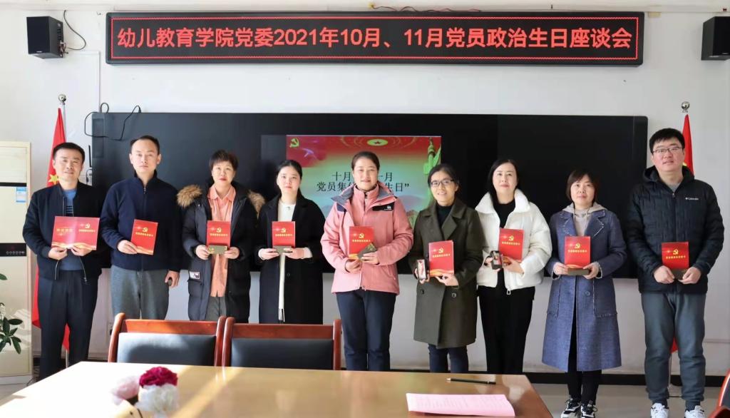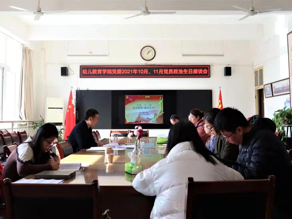 为进一步增强党员凝聚力和归属感,唤醒党员的入党初心,2021年11月15日,幼儿教育学院党委在启真楼307会议室开展“政治生日”主题党日活动,为10月和11月的8位党员教师集体“过生日”。党日活动由党委副书记(主持工作)王继康同志主持。