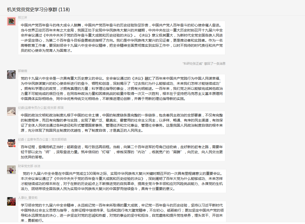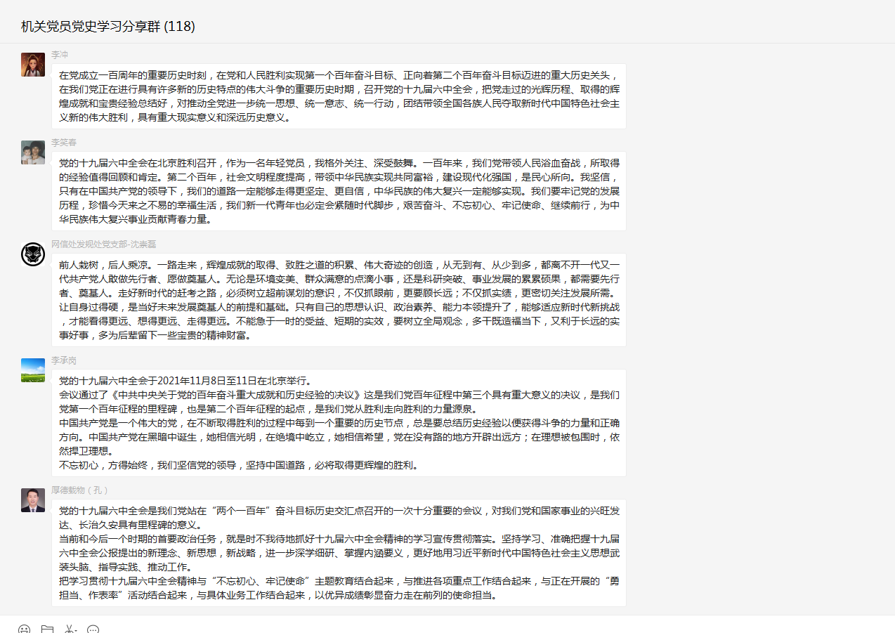 机关120余名党员干部通过广播、电视、报纸、网络等方式关注并认真收听收看全会报道,掀起热学热议高潮。大家深受鼓舞,倍感振奋,并充分利用“党员党史学习微信群”平台,结合工作和生活实际,抒发各自的切身感受与学习体会,在交流中学习、在感悟中提升,11日-13日期间群内分享互动次数达一百余次。