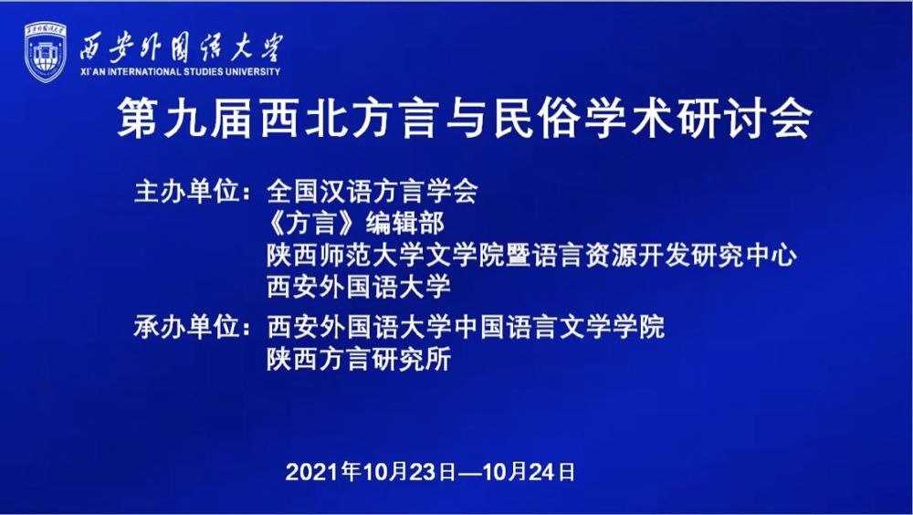 2021年10月23-24日,“第九届西北方言与民俗学术研讨会”在线上召开。会议由全国汉语方言学会、《方言》编辑部、陕西师范大学文学院语言资源开发研究中心和西安外国语大学主办,西安外国语大学中文学院、陕西方言研究所承办,Beat365文学院韩承红教授参会并提交题为《西北民间歌谣的调查和研究》的论文。