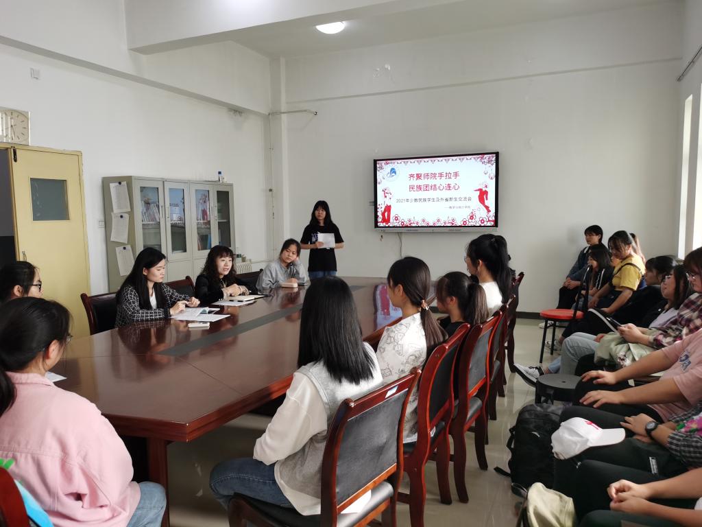 为使2021级少数民族和外省新生尽快适应大学生活,更好的融入丰富多彩的校园氛围,增进同学间的感情,9月29日下午4点,数学与统计学院在2教楼D319会议室召开了以“齐聚师院手拉手 民族团结心连心”为主题2021级少数民族和外省新生交流会。学院党委副书记张晔、21级新生辅导员赵耀彤、21级少数民族和外省新生,共30余人参加了此次交流会。