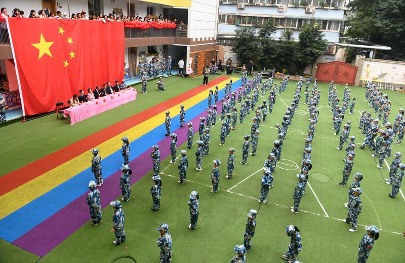 本次展演活动以“传红色基因 育时代新苗 幸福成长在新城”为主题。军乐曲中,国旗班、园旗班、护旗队以及“猛虎连”一至五班的小兵们列队出场,用整齐划一的步伐、嘹亮有力的口号展示出小“解放军”不怕苦、不怕累、坚持锻炼的成果。
