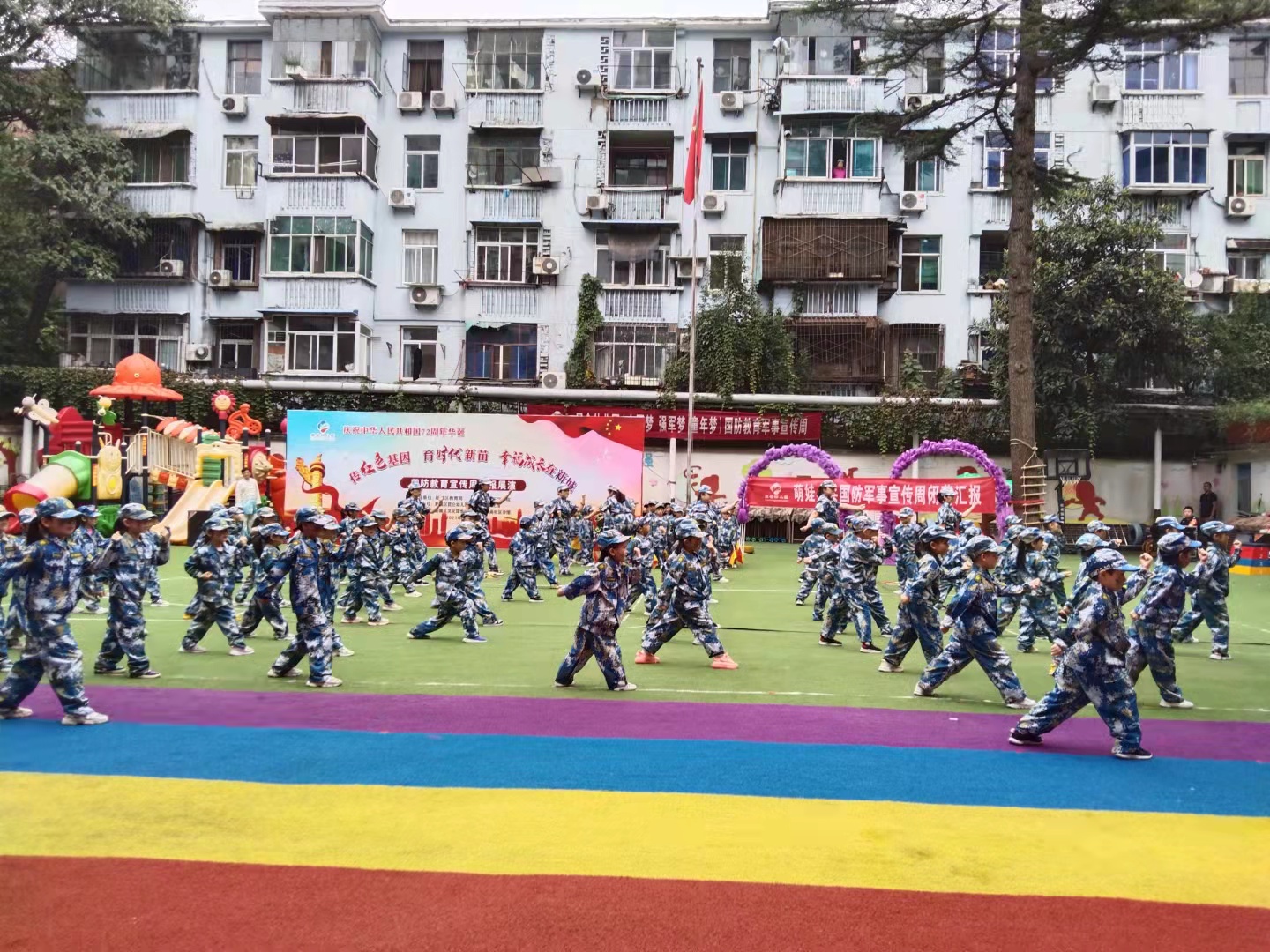 为庆祝伟大的祖国72周年华诞,贯彻落实习近平总书记红色基因传承从娃娃抓起的思想,Beat365建设的“陕西红色基因传承大中小幼共育工程”联合体单位新城区昆仑幼儿园,举行“萌娃小兵”国防教育军事宣传周活动,为祖国母亲生日献礼!