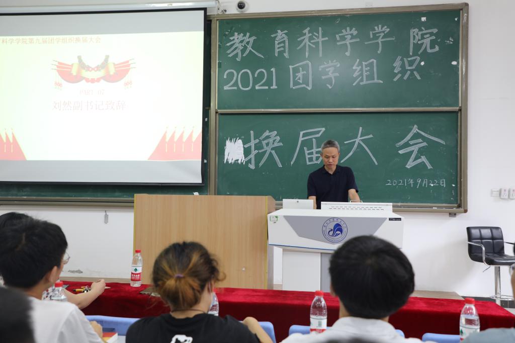 2021年9月22日中午,教育科学学院第九届团学组织换届大会暨学生会工作人员培训开幕式在一教楼阶B1召开。教科院党总支副书记刘然,教科院团总支书记张书涵,辅导员高薇、赵洋老师,以及本学院团学组织全体人员参加了大会。校级团学组织和其他兄弟学院学生干部受邀出席本次大会。